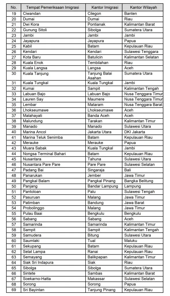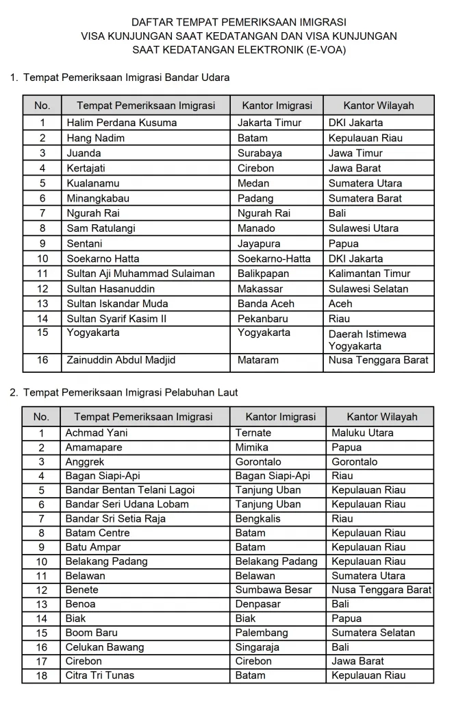 JAKARTA – Direktorat Jenderal Imigrasi menerbitkan Surat Edaran Nomor IMI-0018.GR.01.01 Tahun 2023 yang menambahkan Kazakhstan dalam daftar negara penerima fasilitas Visa Kunjungan Saat Kedatangan atau Visa on Arrival pada Rabu (18/01/2023). Saat ini terdapat sebanyak 87 Negara, Pemerintah Wilayah Administratif Khusus Suatu Negara, dan Entitas Tertentu yang menjadi subjek Visa on Arrival Indonesia. “Sementara itu, subjek Bebas Visa Kunjungan (BVK) masih sama, yakni negara-negara ASEAN meliputi Brunei Darussalam, Filipina, Kamboja, Laos, Malaysia, Myanmar, Singapura, Thailand dan Vietnam,” terang Subkoordinator Humas Ditjen Imigrasi, Achmad Nur Saleh, Kamis (19/01/2023). Pemutakhiran kebijakan ini, sebutnya, dilakukan berdasarkan hasil evaluasi pemanfaatan Visa on Arrival dan memperhatikan trend kunjungan Warga Negara Asing (WNA) ke Indonesia yang terus meningkat. Baca Juga: Kapan WNA Bisa Ajukan e-VOA dan Berapa Lama Batas Waktu Penggunaannya? Ini Jawabannya Achmad mengingatkan bahwa e-VOA berlaku selama 30 hari sejak kedatangan dan dapat diperpanjang satu kali di kantor imigrasi di seluruh Indonesia, namun tidak dapat dialihstatuskan ke jenis izin tinggal lain. Bebas Visa Kunjungan berlaku selama 14 hari dan tidak dapat diperpanjang. Adapun daftar Tempat Pemeriksaan Imigrasi (TPI) terbaru yang melayani WNA subjek e-VOA sudah tersedia pada halaman informasi di website Molina Imigrasi. Daftar TPI yang melayani BVK yaitu sebagai berikut: